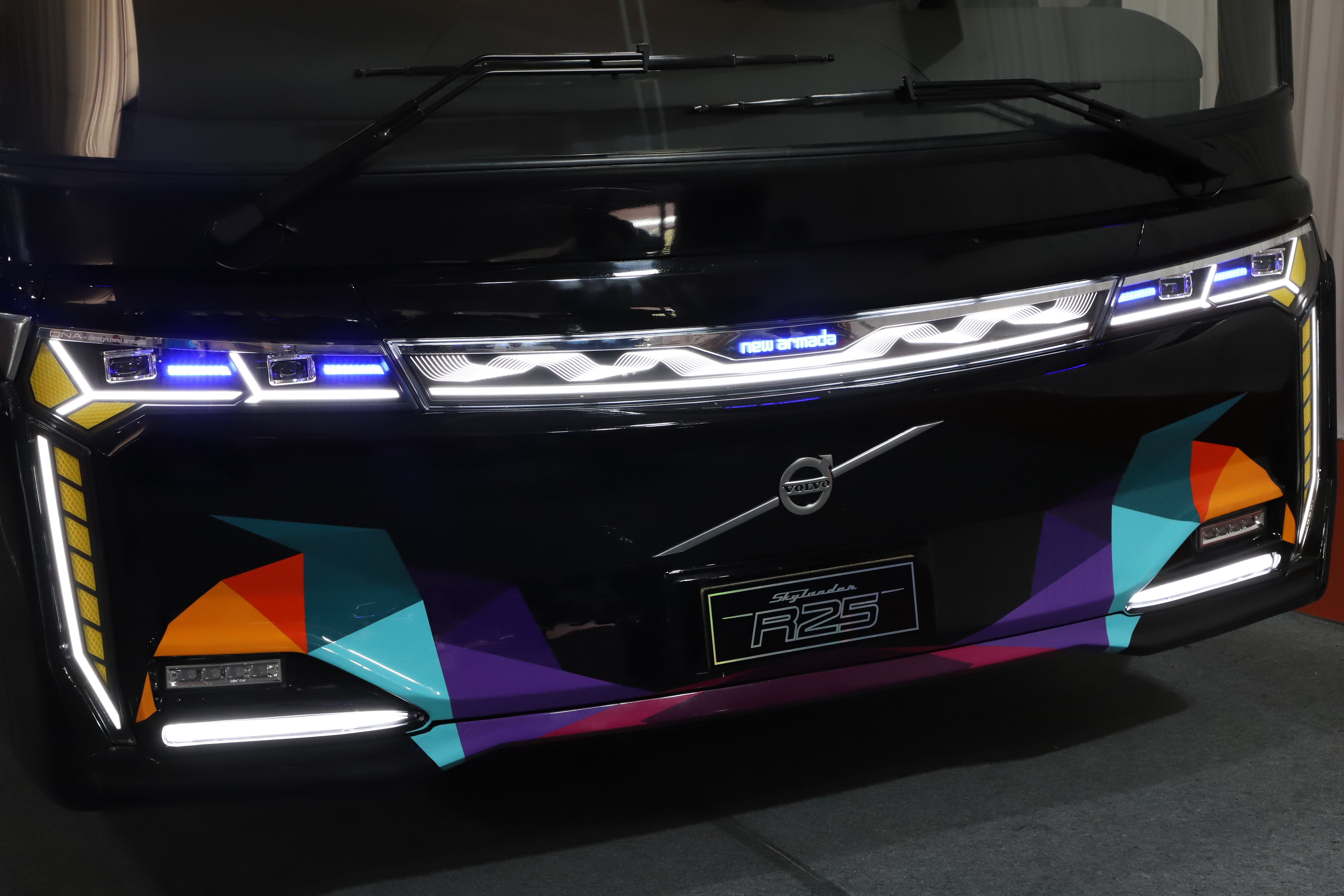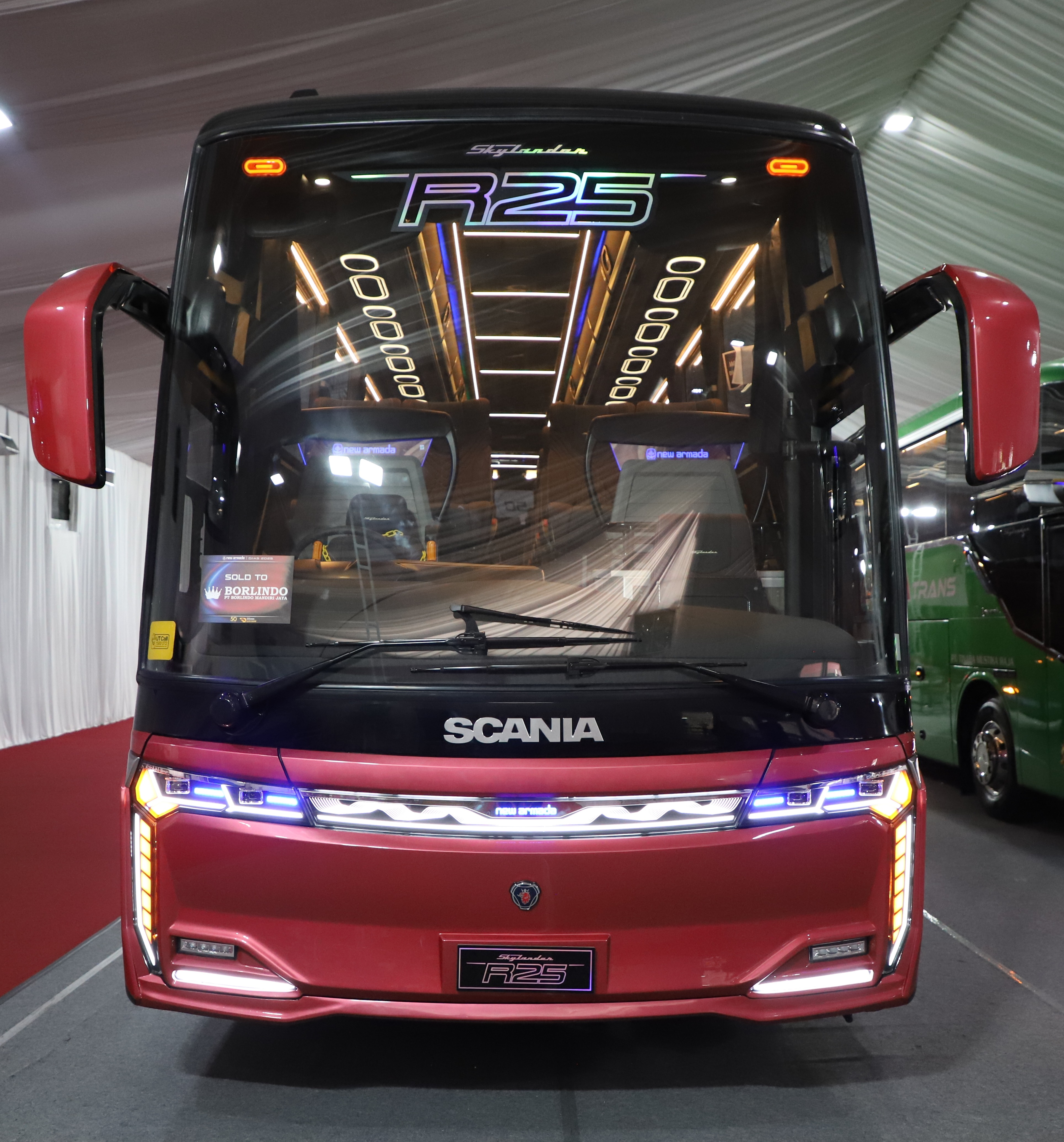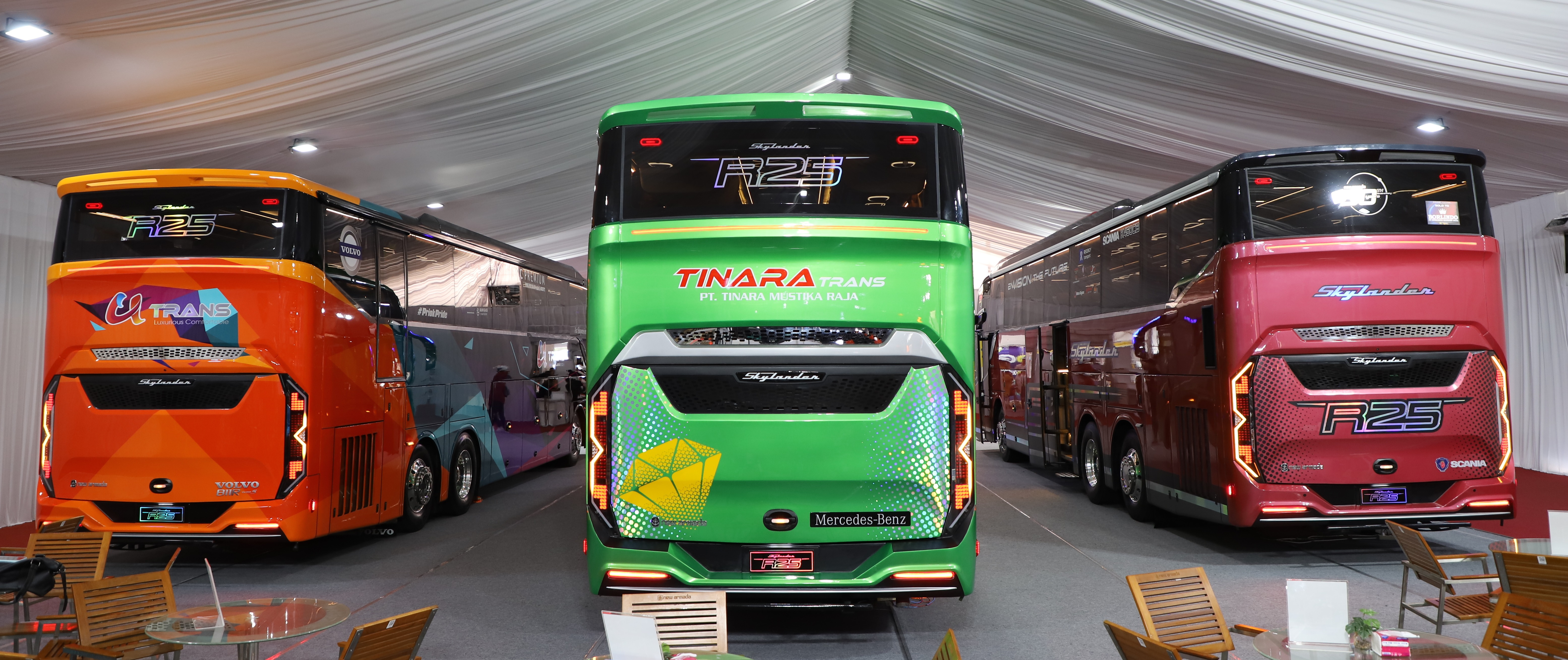 Thursday, July 24, 2025 — New Armada officially launched its latest lineup, the Skylander R25, at the Gaikindo Indonesia International Auto Show (GIIAS) 2025, held at ICE-BSD Tangerang, Indonesia. The company introduced 3 new units: the Skylander R25 Single Glass built on a Scania K-450 chassis, the Skylander R25 Double Glass on a Mercedes-Benz OH 1626 L chassis, and the Skylander R25 SHD Double Glass on a Volvo B11R chassis.